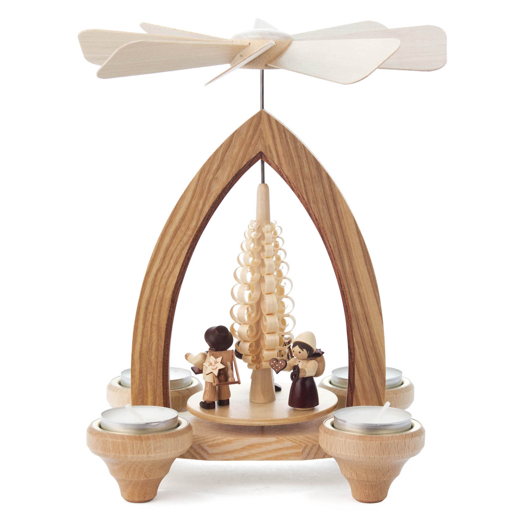 USE: Place the candle in the designated holders on the pyramid. Heat from the candle will slowly cause the blades to rotate. *Please only use candles made specifically for authentic German pyramids. Only these provide an even flame so that the pyramid does not stop and/or blacken the blades. For more candle options, click here!