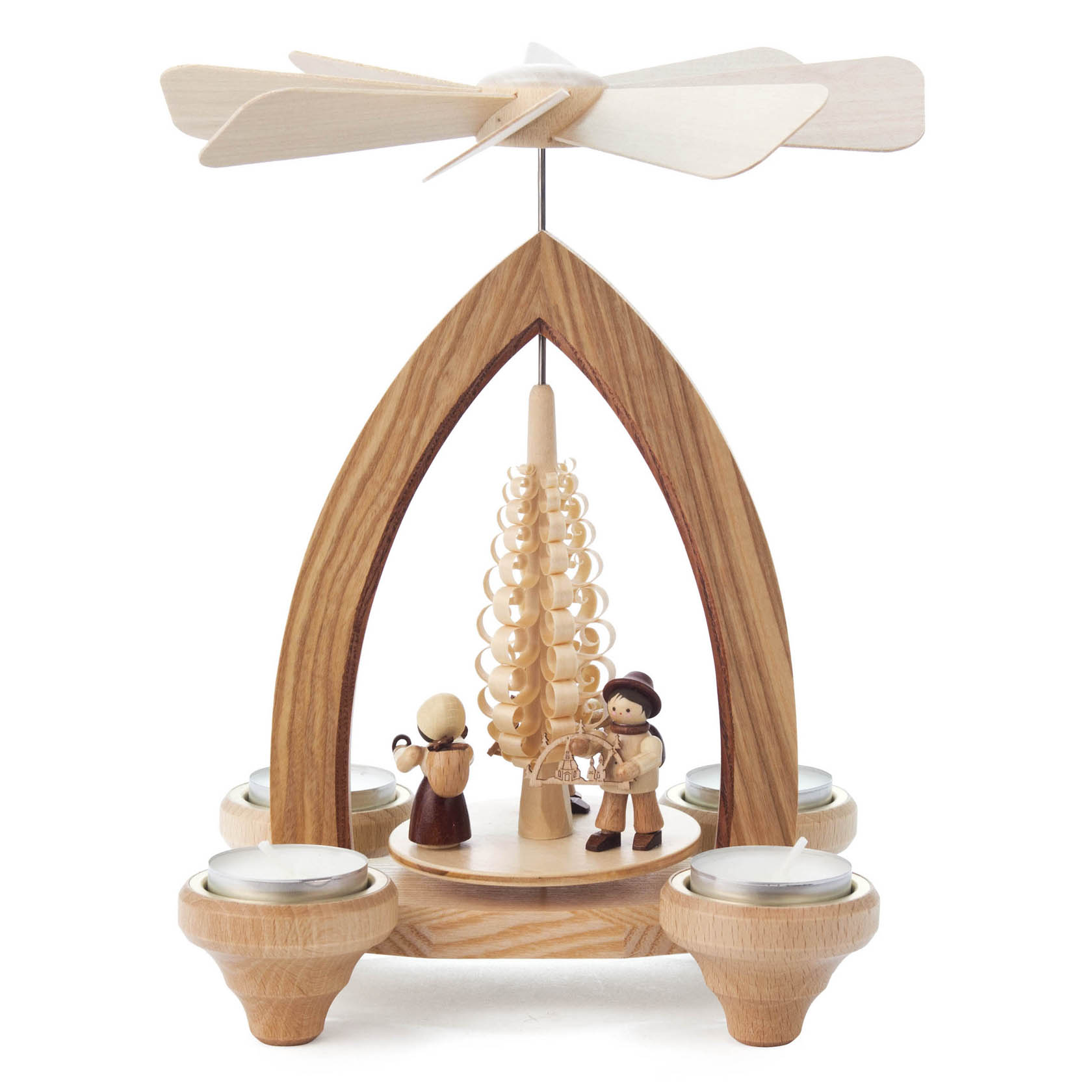 Discover the traditional craftsmanship of the Erzgebirge with our charming Christmas pyramid. Each piece is one-of-a-kind thanks to the unique wood grains and features a mix of warm brown and natural tones. At its center, a chip tree stands tall surrounded by 3 rotating figures including a toy merchant, a gingerbread seller, and a Schwibbogen merchant. All bringing festive cheer to life! This pyramid adds a cozy, heartwarming glow to any space.