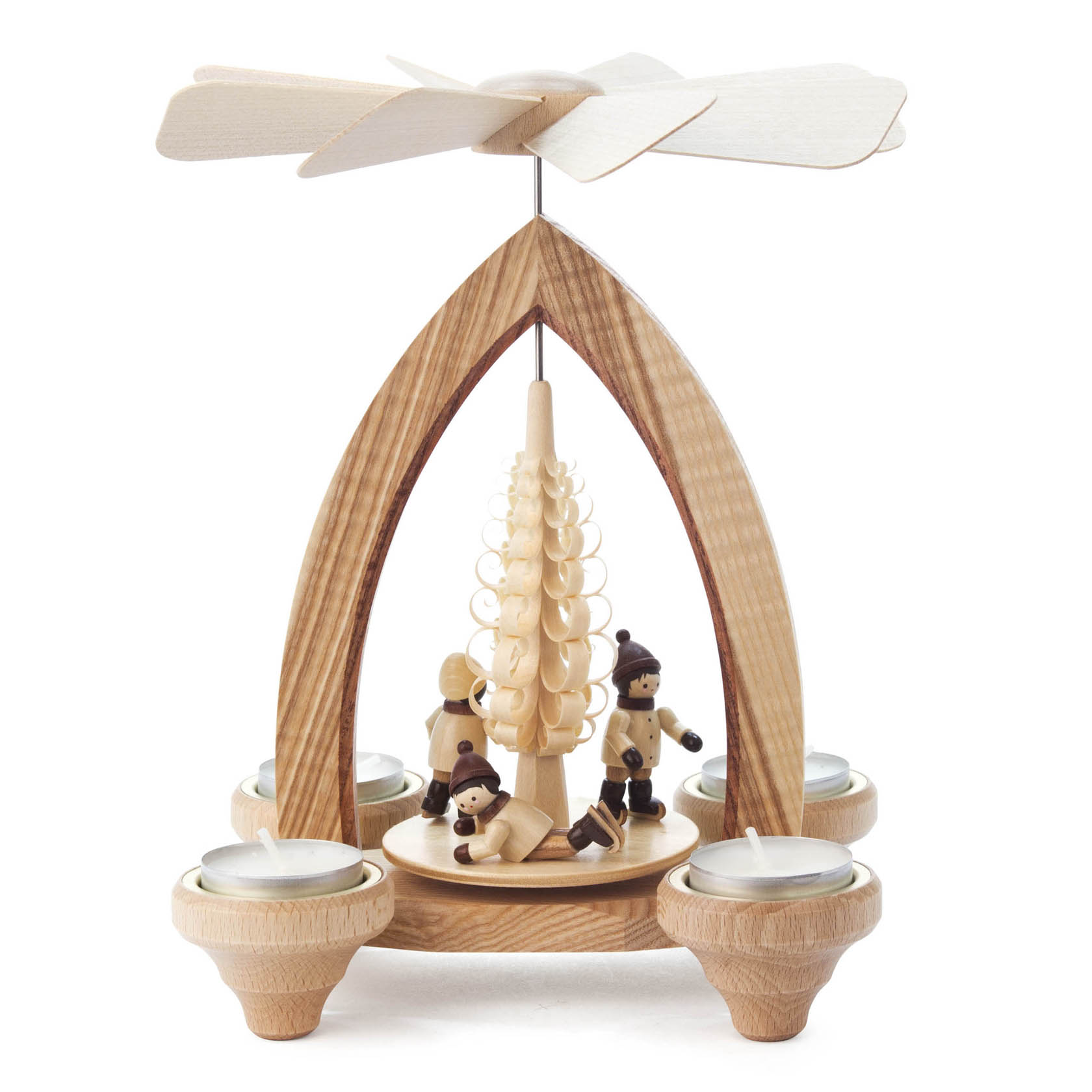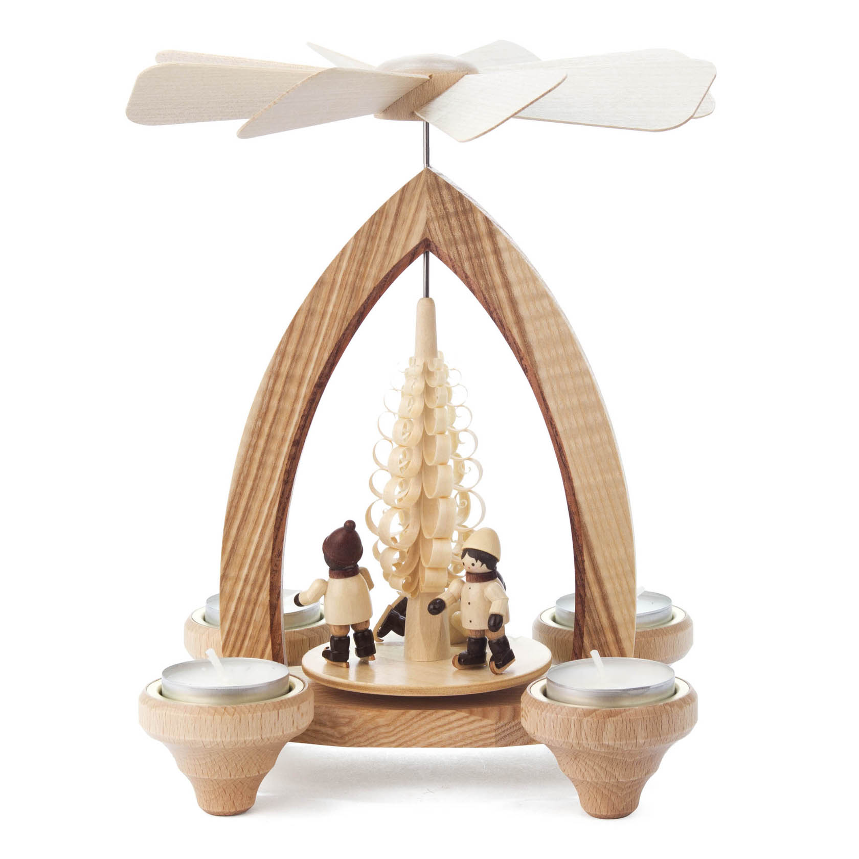 This Erzgebirge Christmas pyramid is a charming highlight that brings festive magic to your home. It depicts winter children ice skating, with one having taken a tumble onto its belly still learning to keep pace with the rest. A wooden tree forms the central axis, letting the platform spin gently. The soft rotation creates a warm, peaceful atmosphere in your living room and tealights set the whole scene in motion.