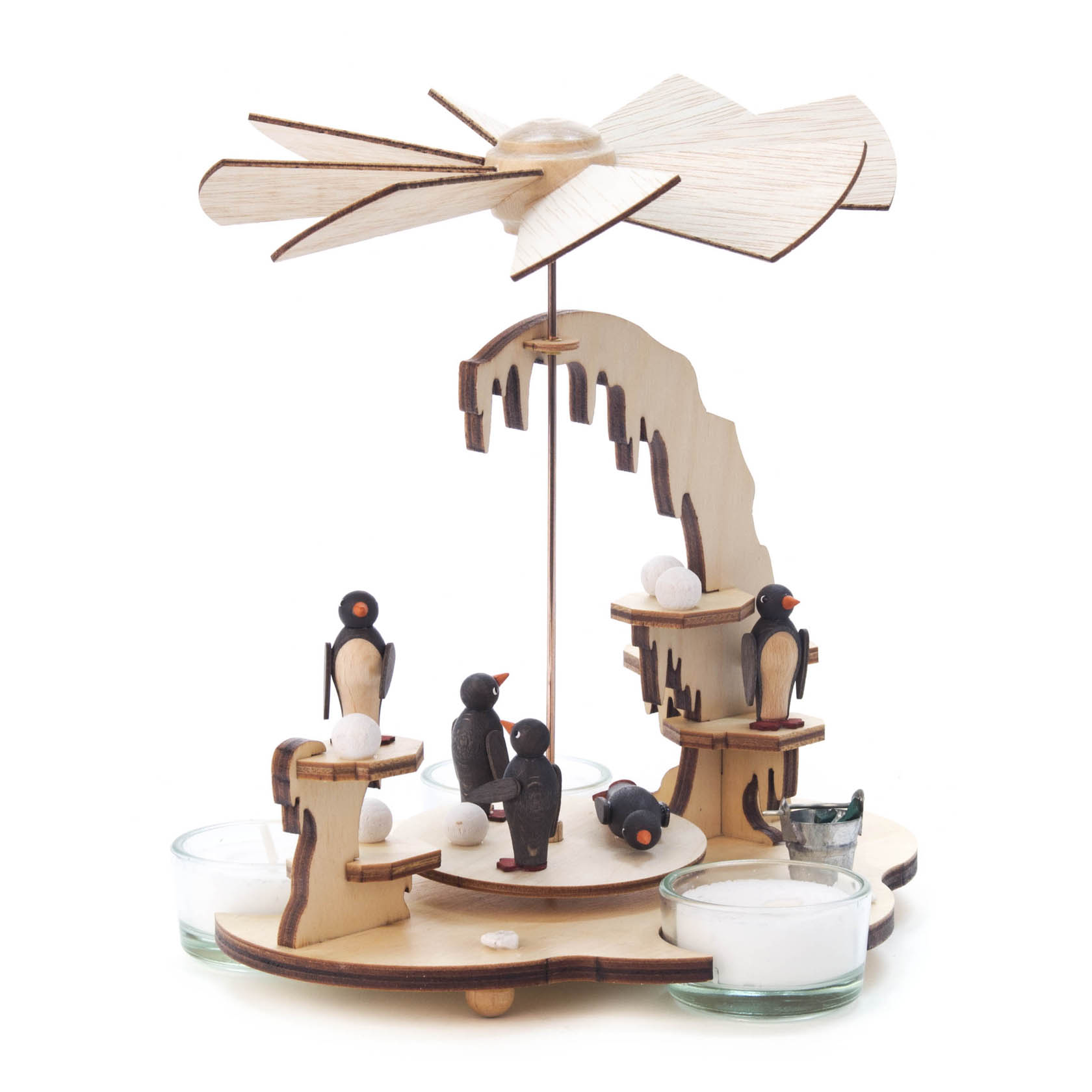 The Erzgebirge pyramid features five playful penguins that bring a cozy touch to your home. Shaped like a frosty snow cave, it beautifully captures the essence of winter. Light a few tealights, and the penguins at the center start to spin bringing the scene to life. The gentle turning and warm glow of the candles create a snug, inviting atmosphere that makes the holiday season even more magical.