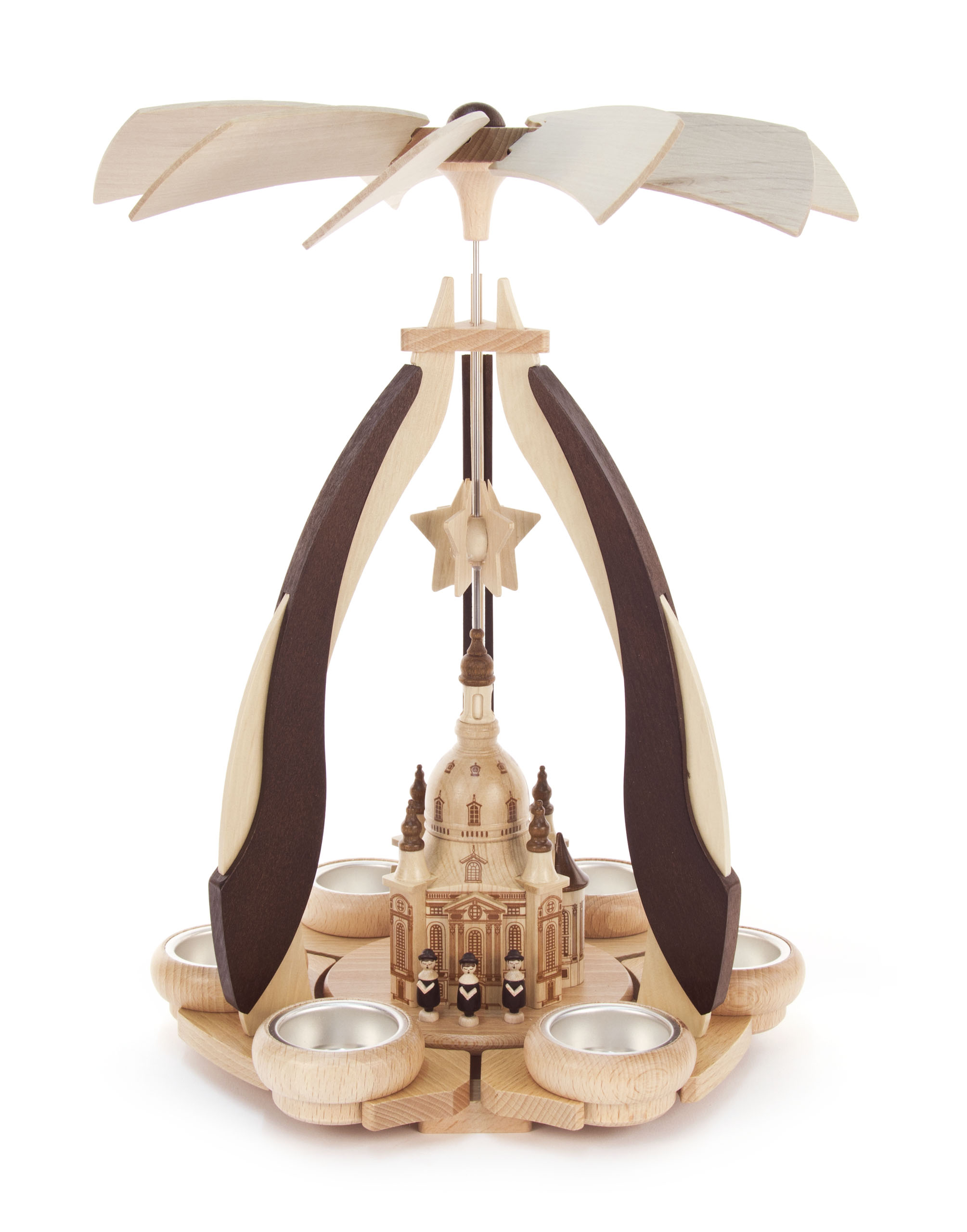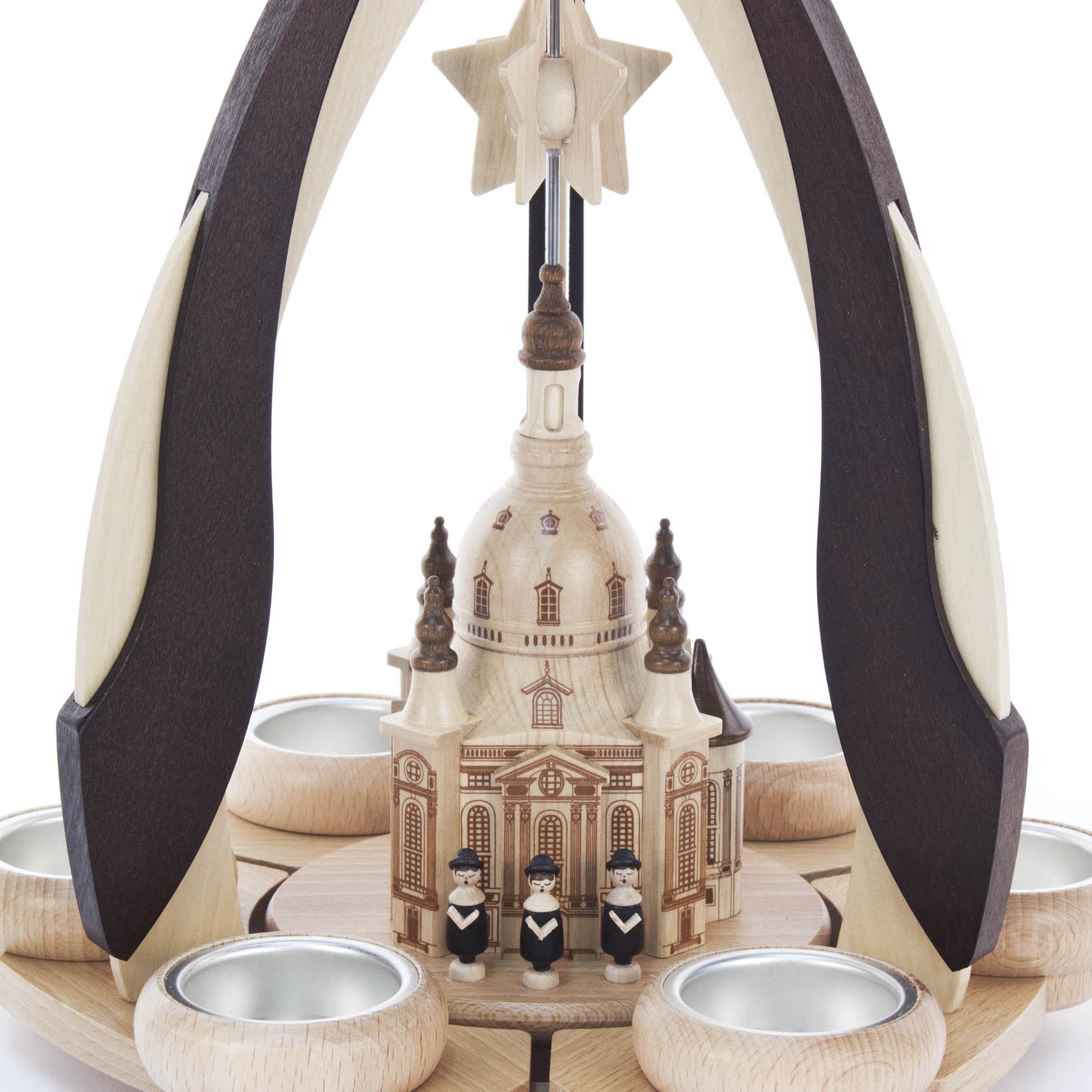 This Christmas pyramid isn’t just a beautiful decoration, it’s a real standout in any room. Its modern design, blending light and dark woods, fits seamlessly into any style of decor. The centerpiece is a rotating disc featuring the Dresden Frauenkirche, with three carol singers in front adding to the festive charm. It’s a true gem that’s hard to resist, and you can set it in motion with six tealights.