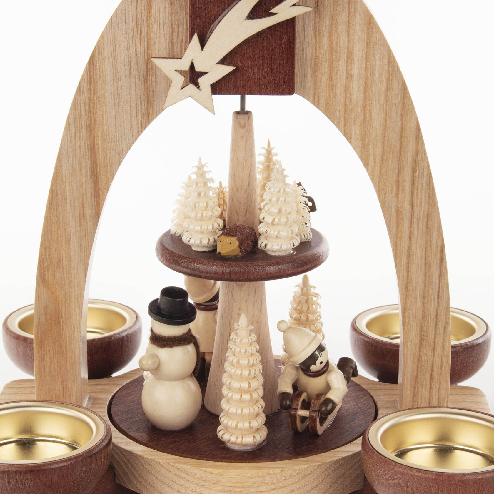 With its warm natural tones and rich dark brown accents, the Erzgebirge Christmas pyramid is a charming centerpiece for any room. This two-tier design holds tealights, with the lower rotating platform displaying a winter child on a sled, another with skis, a snowman, and three spiral trees. The upper platform features a squirrel and a hedgehog nestled among six spiral trees. Topping it all off, the dark brown propeller adds the perfect finishing touch to its delightful look.