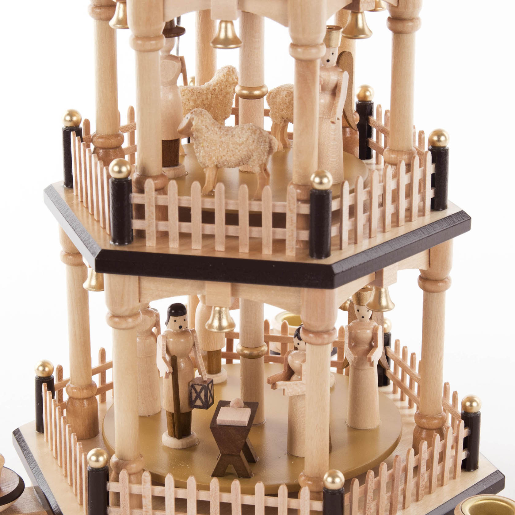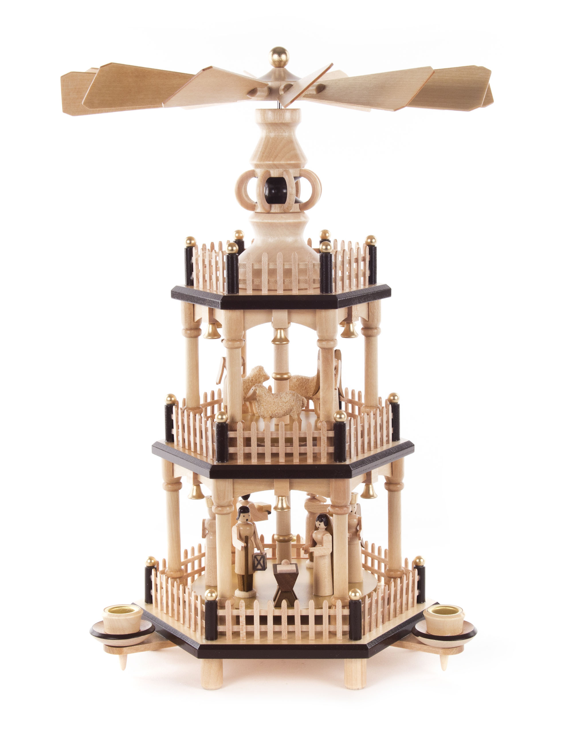 This three-tiered pyramid is a stunning centerpiece that will stand out in any Christmas display. The first tier showcases the Holy Family with the Three Wise Men presenting gifts to baby Jesus, while the second-tier features shepherds and a sheep, completing the charming scene of the Christmas story. Made from high-quality wood with a natural finish, it’s accented by black-brown details for a touch of elegance, further enhanced by golden spheres. The gentle heat from the candles sets the fan in motion, making each tier gracefully rotate.