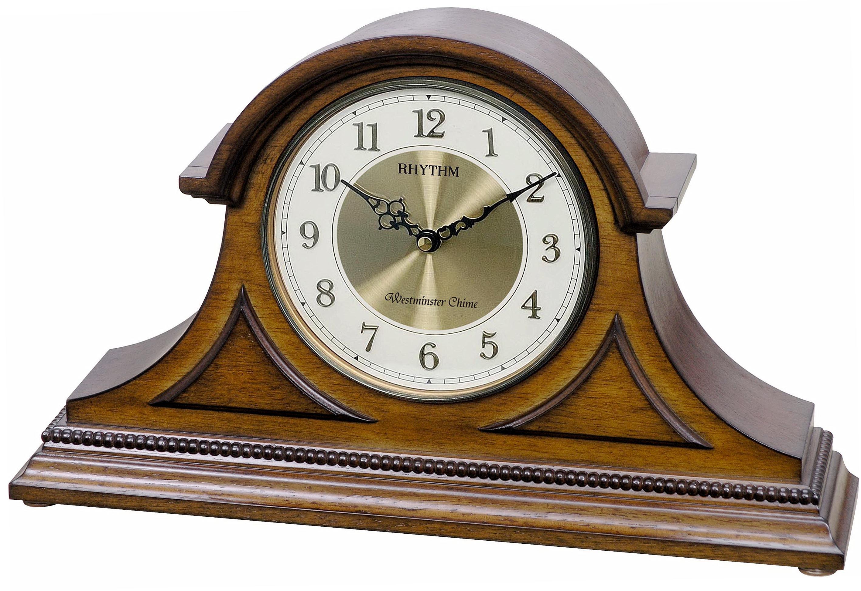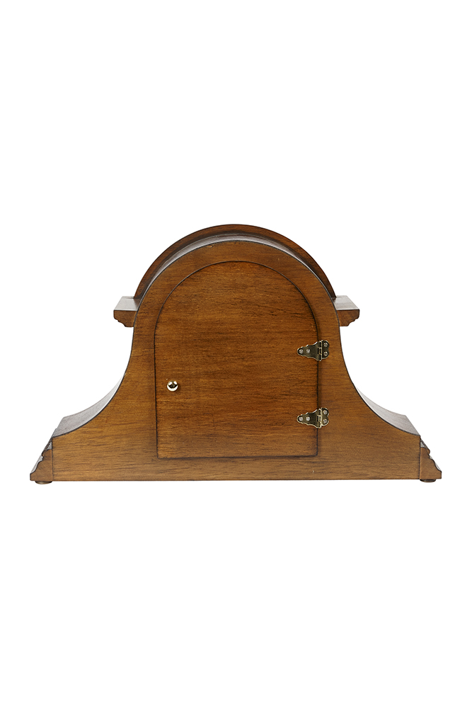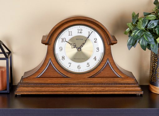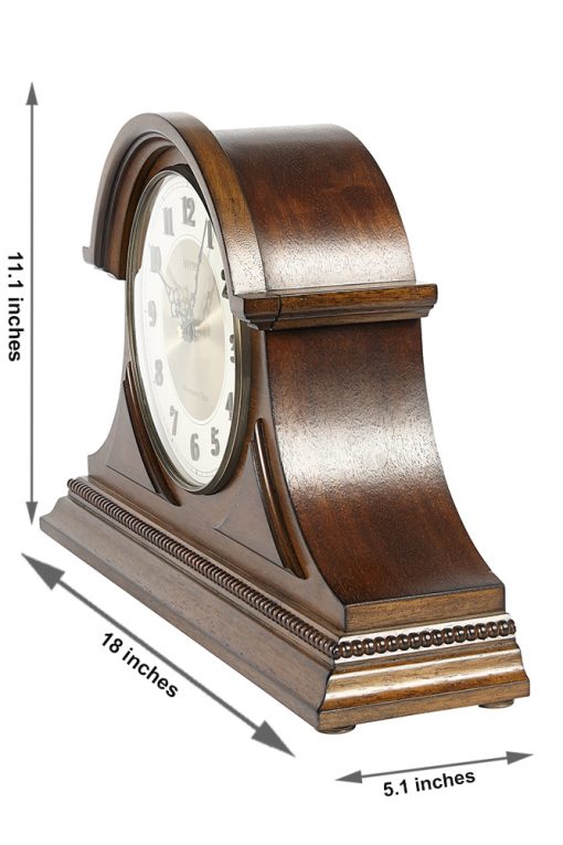 Dressed with exceptional corner overlays and beaded woodworking, the Remington II is a traditional tambour style clock with brass and cream-colored dial. Stained to give it an old American look, this clock will beautifully compliment your mantel. The clock comes with the signature WSM movement, which allows you to play 18 melodies, an hourly and quarterly Westminster chime, and 3 Christmas melodies. The clock is battery quartz operated.